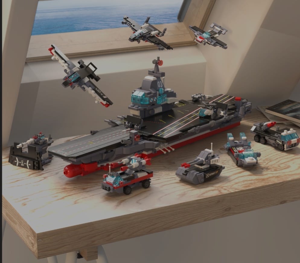 Tip construcție: Este un set 8-în-1, ceea ce înseamnă că piesele pot fi folosite pentru a construi fie un portavion mare, fie opt vehicule militare mai mici (deși nu simultan).