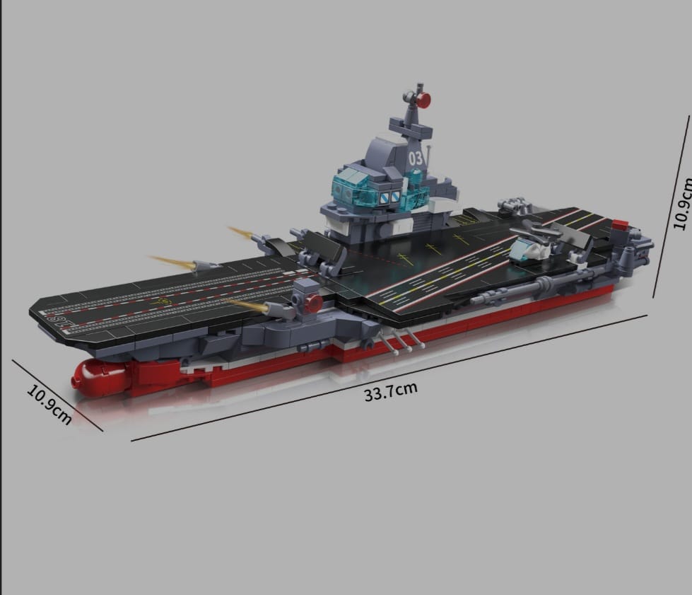 Setul de construcție prezentat în imagine este un portavion militar din cărămizi, fiind un model compatibil cu alte mărci populare de blocuri de construcție.