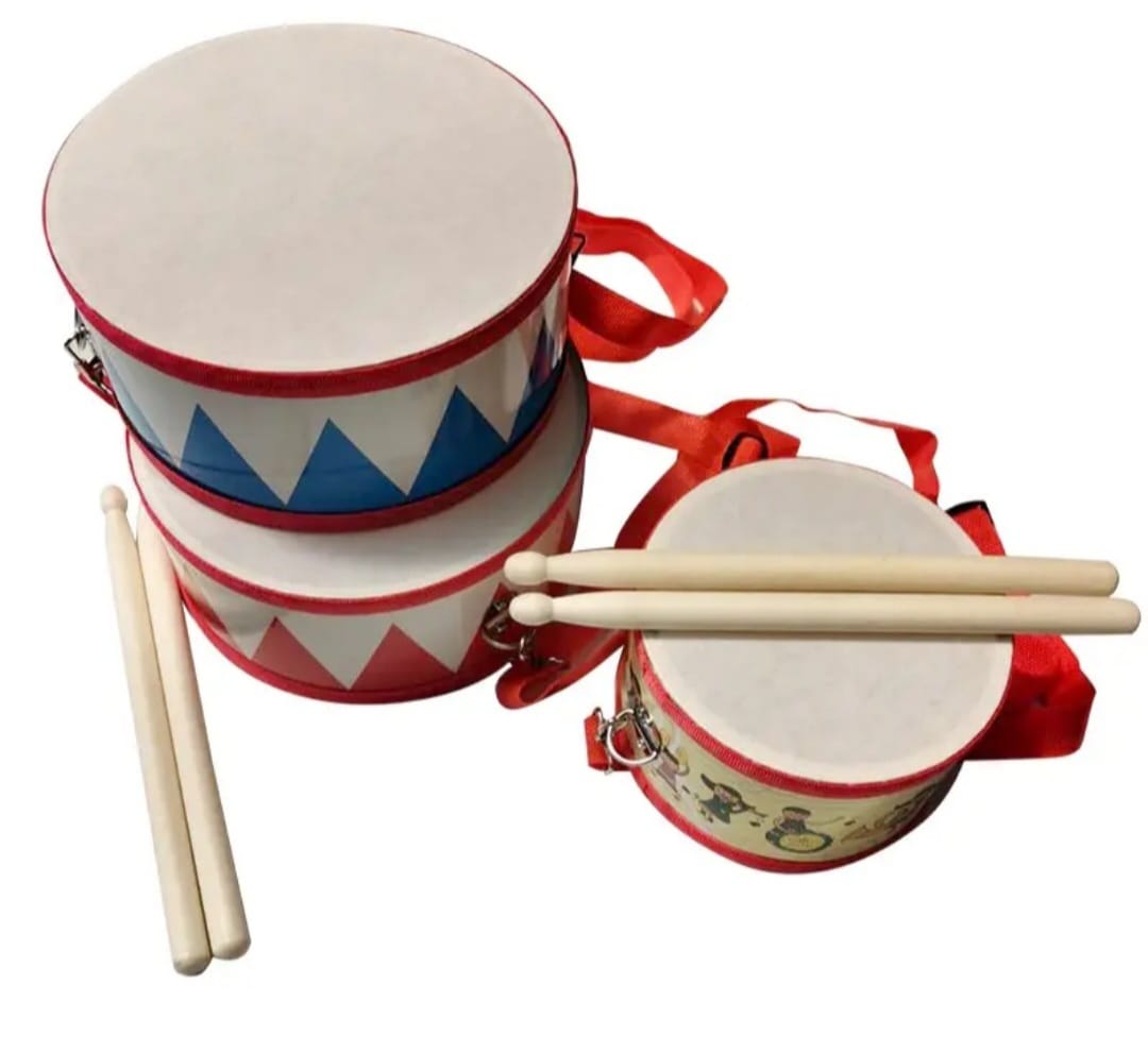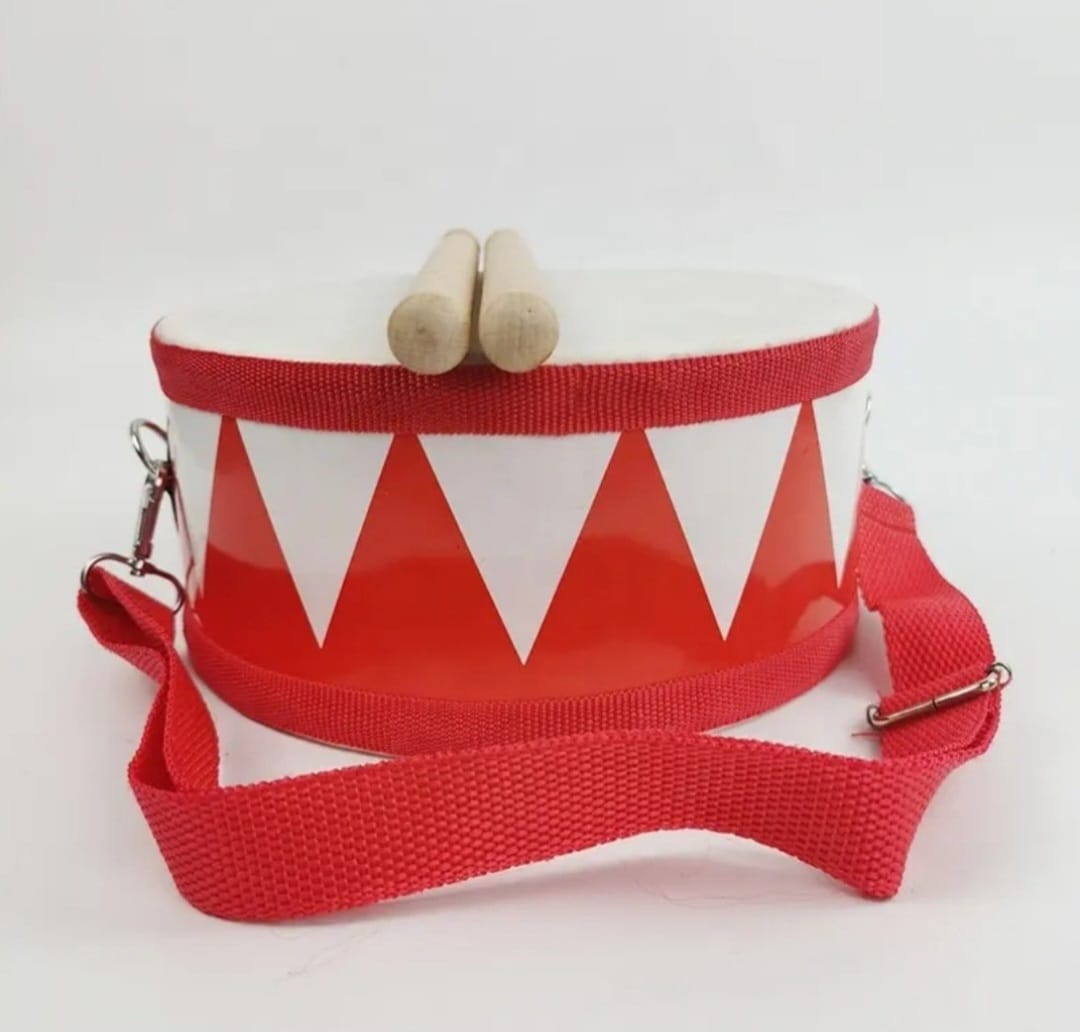 Jucăria din imagine este o tobă pentru copii, de culoare roșu și alb, care vine cu două bețe de lemn și o curea ajustabilă pentru transport. Este un instrument muzical de percuție simplu, conceput pentru a introduce copiii în lumea muzicii și a ritmului.